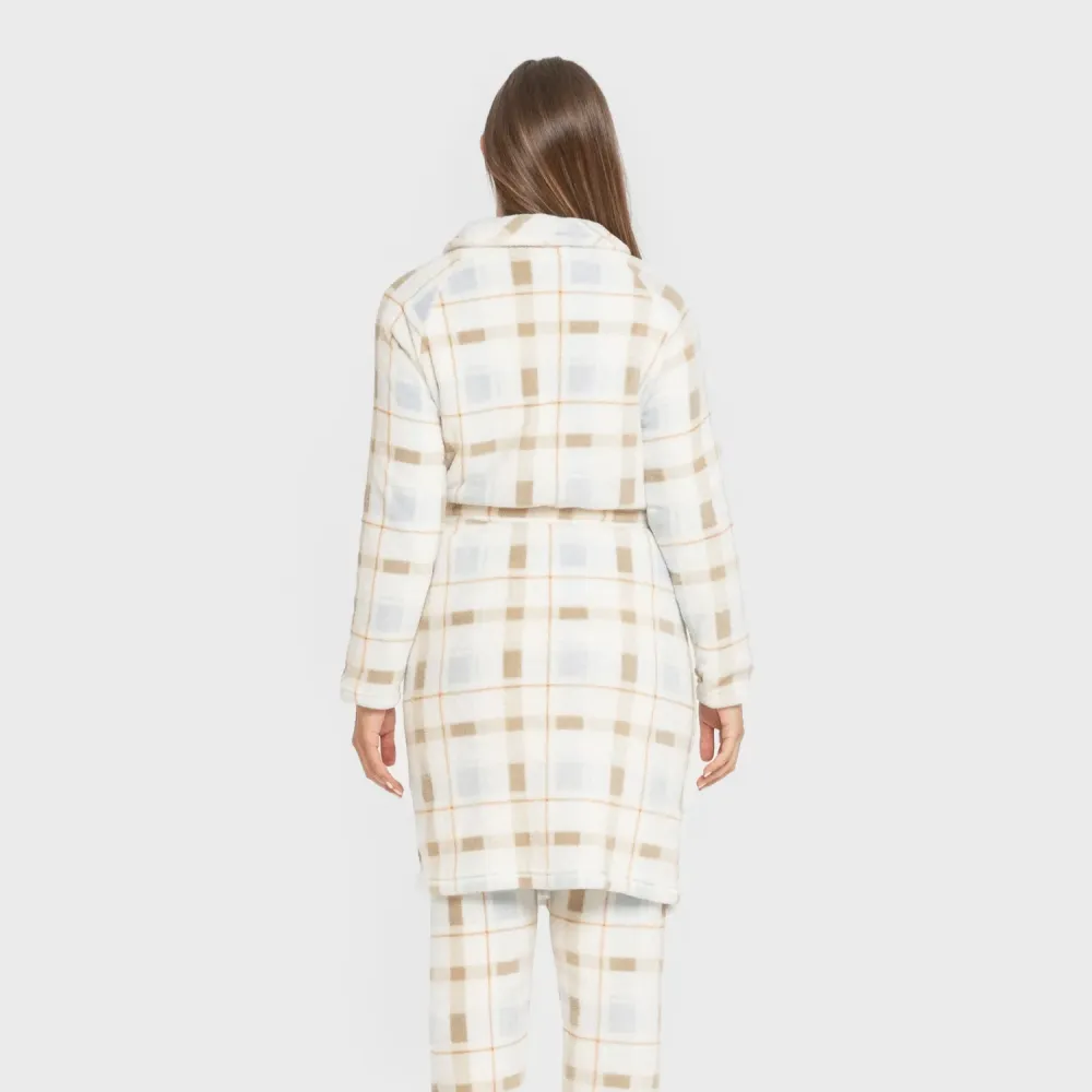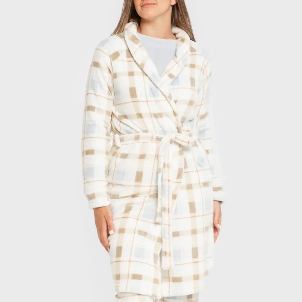 Robe branco com estampa de quadros em azul e areia em tecido de coralina muito macio, ajustável com cinto.